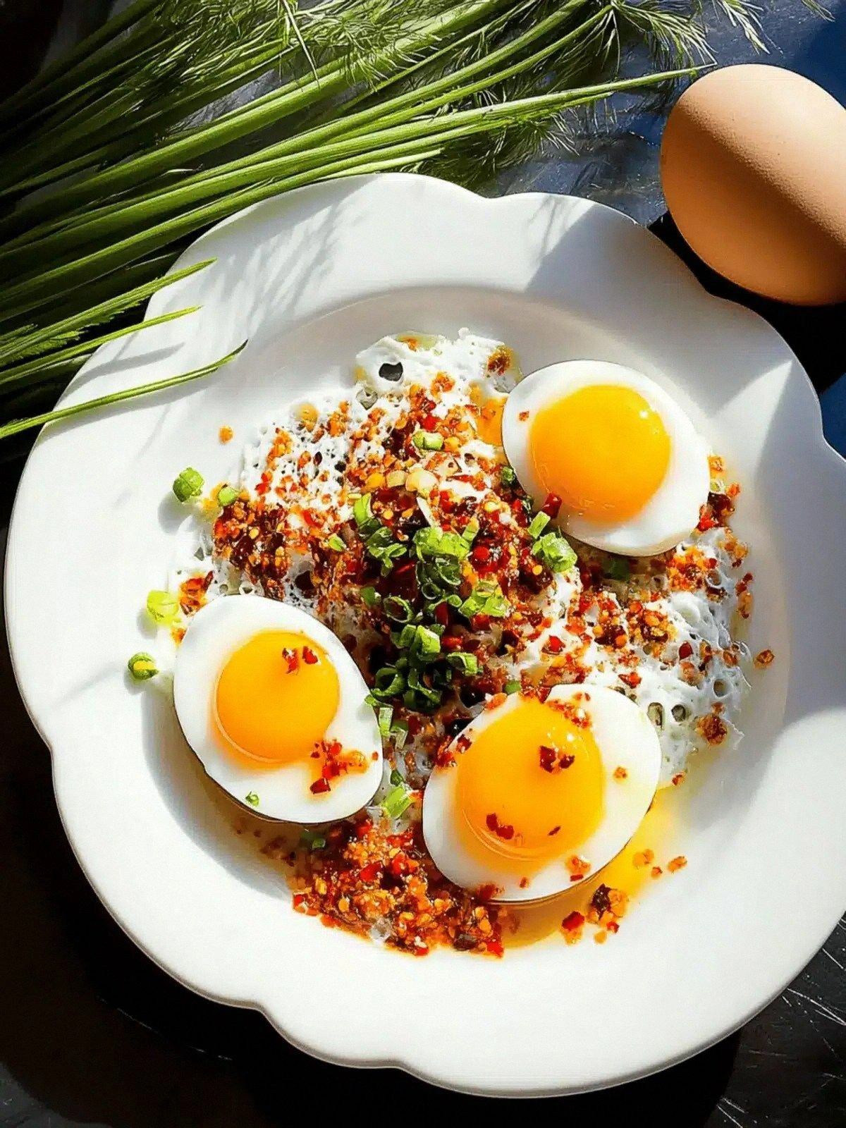 - Once the eggs are cooked to your liking, transfer them onto a plate lined with a paper towel to absorb excess oil. While they rest, sprinkle the sliced green onions over the top for a burst of freshness. The contrast of the hot, oily eggs with the crisp green onion is a flavor explosion that keeps the dish lively.