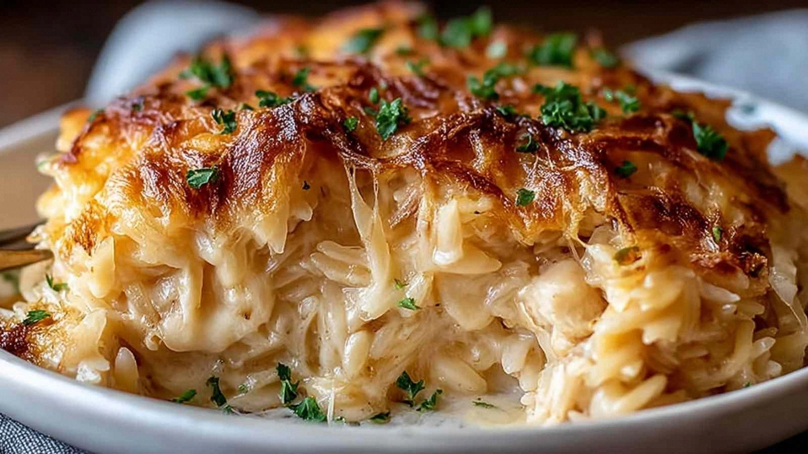 Picture this: the moment you lift the lid, a fragrant cloud of caramelized onions, garlic, and herbs fills the air. Your taste buds are already tingling with anticipation. The sauce is a silky blend of white wine, beef broth, and heavy cream, coating the orzo like velvet. The chicken is juicy, each bite releasing a burst of savory goodness. And the top is a golden, bubbly crust that crackles when you take a spoonful—pure, buttery bliss.
