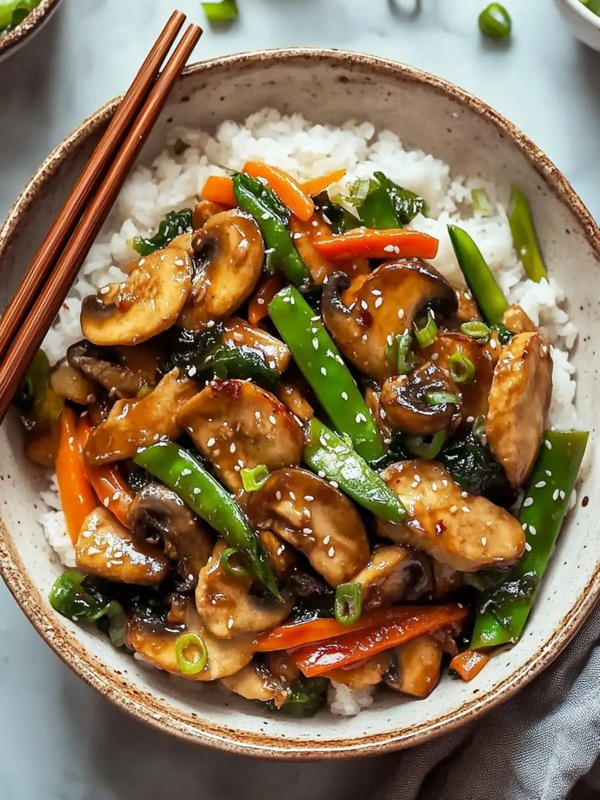 Mushrooms, snow peas, asparagus, and carrots bring a range of textures that keep the dish exciting. Mushrooms soak up the sauce and add earthiness. Snow peas provide a crisp snap that contrasts with the tender asparagus. The carrots, sliced thin, give a sweet crunch that balances the savory sauce. Together, they create a layered mouthfeel that is both satisfying and refreshing.